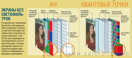 Жидкокристаллические дисплеи состоят из пяти слоев: исходной точкой является белый свет, излучаемый светодиодами и проходящий через несколько фильтров. Поляризационные фильтры, расположенные спереди и сзади, в сочетании с жидкими кристаллами регулируют проходящий световой поток, понижая или повышая яркость. Это возможно благодаря транзисторам пикселей, которые влияют на то, сколько света пройдет через светофильтры (красный, зеленый, синий). Сочетание цветов этих трех субпикселей, на которые наложены фильтры, в итоге дает определенное цветовое значение пикселя. Смешение цветов не вызывает проблем, но получить таким образом чистый красный, зеленый или синий невозможно. Причина здесь кроется в фильтрах, которые пропускают не одну волну определенной длины, а целый пучок различных по длине волн. Например, через красный светофильтр проходит также оранжевый свет.