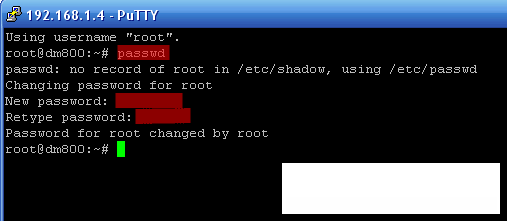Замечу, что по умолчанию на Dreambox 800 нет пароля, а значит SSH не сработает. Сначала с помощью того же телнета :) надо поменять пароль командой: