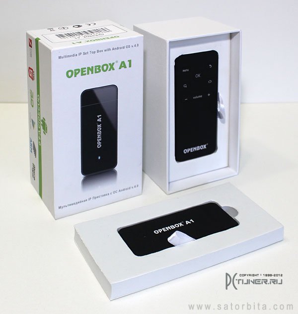 OpenBox A1 упакован в небольшую коробку из плотного картона с фотопечатью. Сверху изображение телеприставки и название модели. Судя по картинке складывается впечатление, что устройство в гладком глянцевом корпусе, на самом деле это не так. По сторонам коробки ряд пиктограмм, используемых технологий и значки соответствия стандартам качества Европейского союза, Украины, и отметка РосТест. Снизу сводная таблица основных характеристик и комплект поставки.