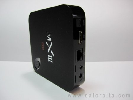 С обратной стороны устройства расположены разъем питания, AV выход, сетевой порт 10/100 , HDMI 1.4b и оптический аудиовыход SPDIF. Справа расположен слот MicroSD, MicroUSB OTG и пару портов USB Host. Сверху MXIII находится кнопка питания, которая включает в себя небольшой светодиодный индикатор.