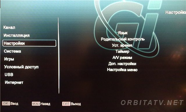 Тут вы можете выбрать желаемый язык интерфейса ресивера, поменять пароль;включить родительский контроль, установить время, часовой пояс.