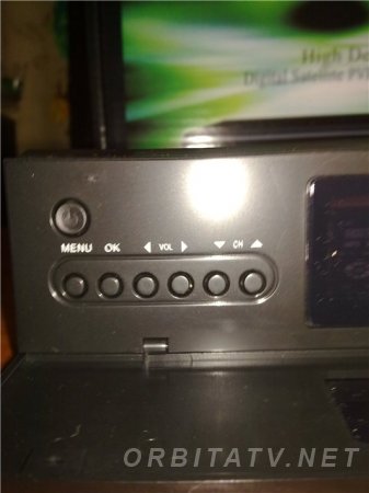 На передней панели слева мы можем увидеть кнопку включения-выключения ресивера, MENU, ОК, <>(регулировку громокости), и кнопки переключения каналов.